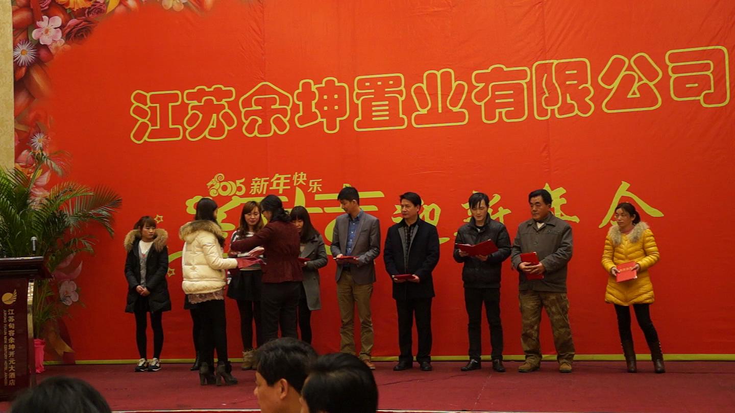江苏余坤置业有限公司羊年迎新年会于2015年2月12日晚于江苏句容余坤开元大酒店隆重举行。董事长徐东萍女士亲临致辞。年会简单的回顾了2014年所取得的成绩、荣誉。徐董对2014年的工作予以了充分的肯定、并展望了2015年美好的前景。总经理陈立英女士也亲临为公司优秀员工颁奖;