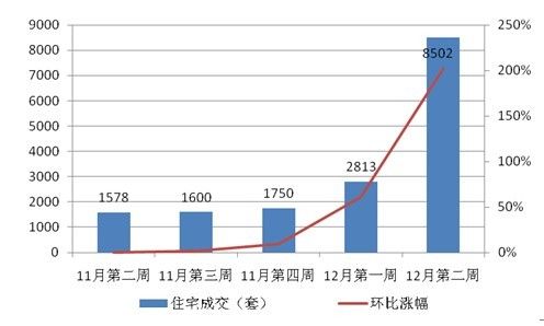 12月第二周北京二手房住宅成交8502套,单周成交量创去年4月调控以来新高。链家地产市场研究部监测的数据显示,其中12月9日单日成交量达到2828套,创2009年以来最高值。而12月11日,二手房住宅网签9套,却是网签历史以来,除春节和国庆节假期后,日成交最低值。从各区域成交情况来看,成交上涨最明显的是近郊区,上涨幅度超过了3倍,链家地产分析认为主要原因是由于消费者抢搭政策末班车“经转商”或者网签。尤其是“经转商”增加导致成交量明显上涨。预计12月成交量大约12000套左右,环比上涨约60%。年底二手房市场呈现出“另类反弹”,并不是市场回暖体现。