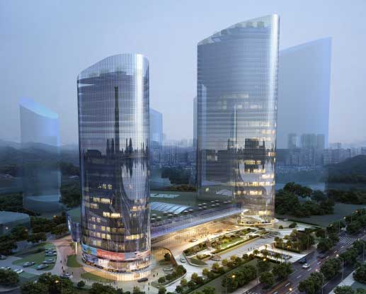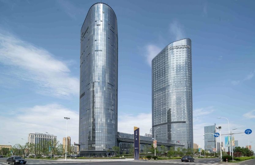 其中高达180米的国际五星级喜来登酒店与120米的商务中心联成双子塔,总高度仅次于百官广场,与城市阳台和音乐喷泉仅一路之隔。