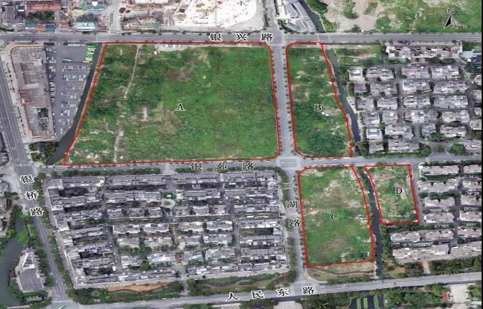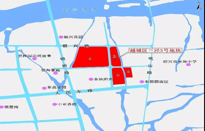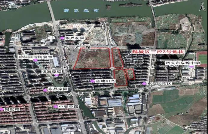 越城区三泾3号地块位于越城区皋埠街道,银兴路以南,地块由道路、自然河流划分为A、B、C、D四个区块。