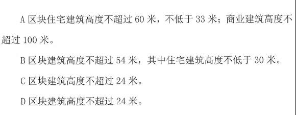 各个区块的建筑高度也各有要求:A区块住宅建筑高度不超过60米,不低于33米,商业建筑高度不超过100;B区块建筑高度不超过54米,住宅建筑不超过30米;C区块建筑高度不超过24米;D区块建筑高度不超过24米。